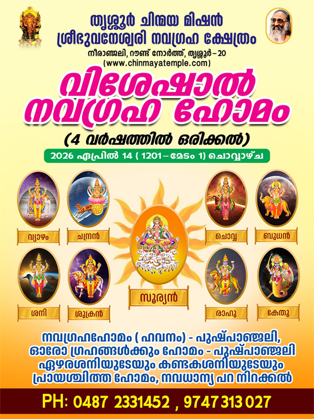 The influence of Navagrahas on human life has been proved by belief and science. During the transit of planets when they stay at favourable positions they give fortunes and benefits and at unfavourable positions, they give mysteries and misfortunes. If the harmful planet and the period of its evil effect are known, the suitable remedy has to be done. For every planet, 15 types of remedies are prescribed. Homa worship and charity are important among them. All types of evolutions of all the moving and unmoving things control the results of our actions in previous births which cause different stages in the progress of human life. Navagrahas control and give these results to us. Zodiacal change in planetary position after sunrise occurs only once in 4 years. The first day of the month of Medam is also the holy day in which sun enters Medam, which is its house of Zodiac on the ascendant. Generally, the first day of Medam is being celebrated as Vishu. In every 4 years, Vishu is celebrated on the second day of Medam and on the first day of Medam special Navagraha Homa is also performed. Since this homa is very special, devotees from various parts of the country reach the temple for witnessing the thanthrik rituals.