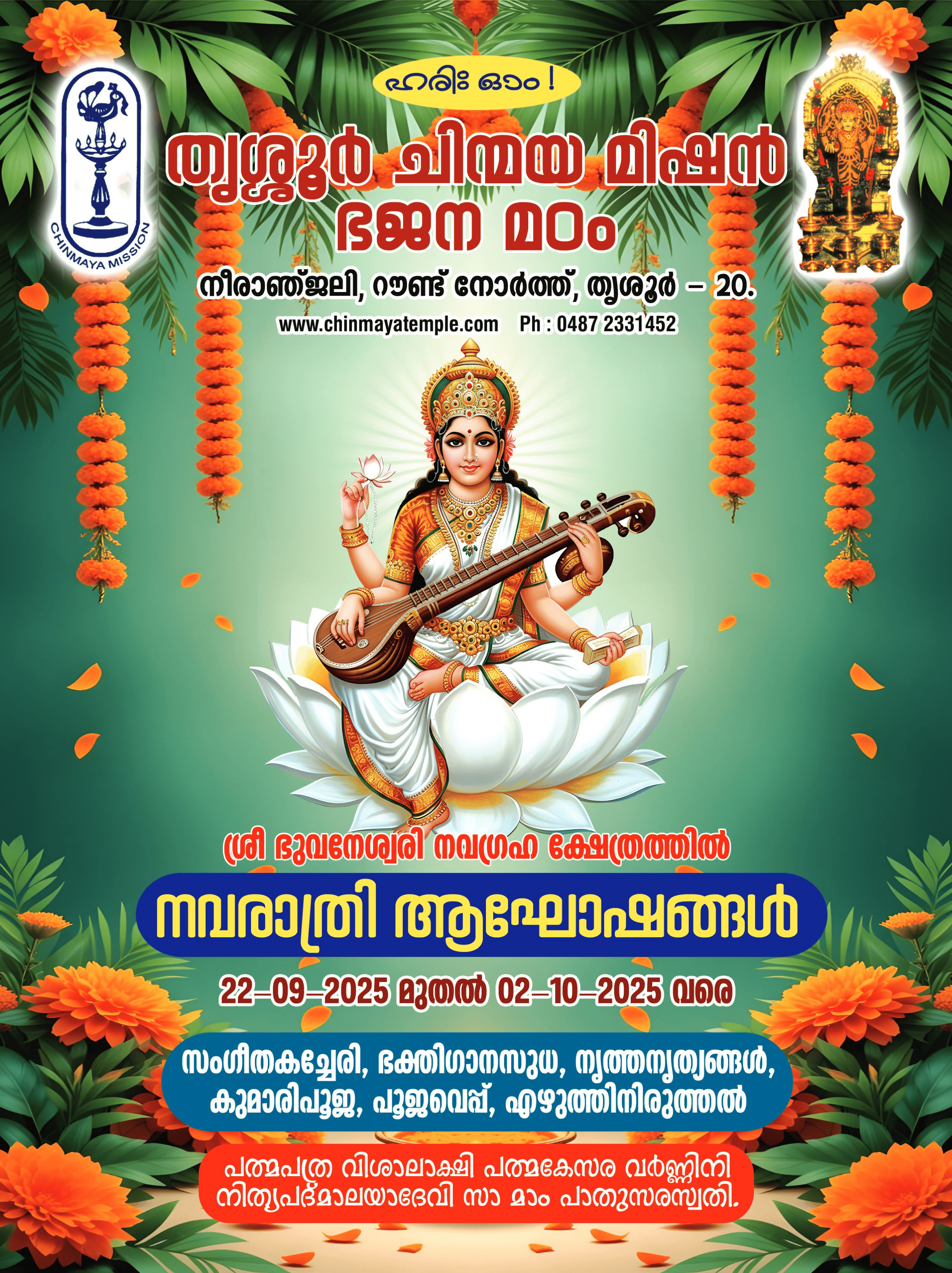 The holy temple of Sree Bhuvaneswari Devi, situated near the northern circumlocution way at the centre of Thrissur City, the cultural capital of Kerala, shines forth as the shelter giving fulfilment of all the wishes of the devotees. The principal deity of the temple is Sree Bhuvaneswari Devi, and Ganapathy and Subhramanya are installed here as upadevathas. This temple is also famous as an ancient Navagraha temple where the nine planets are installed and worshipped with proper rituals.